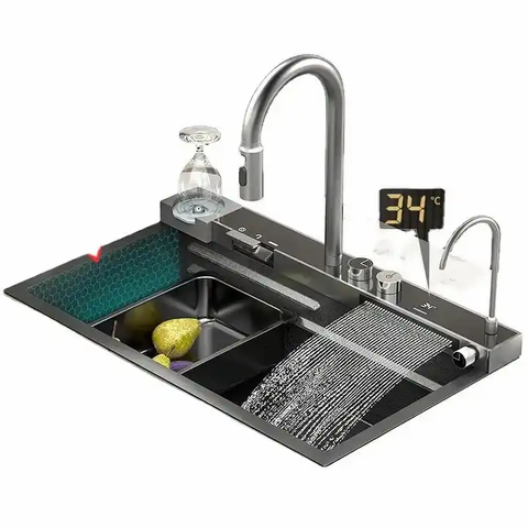 キッチンシンクセット新デザイン多機能ステンレス鋼キッチンシンク黒滝降雨シングルボウルキッチンシンク